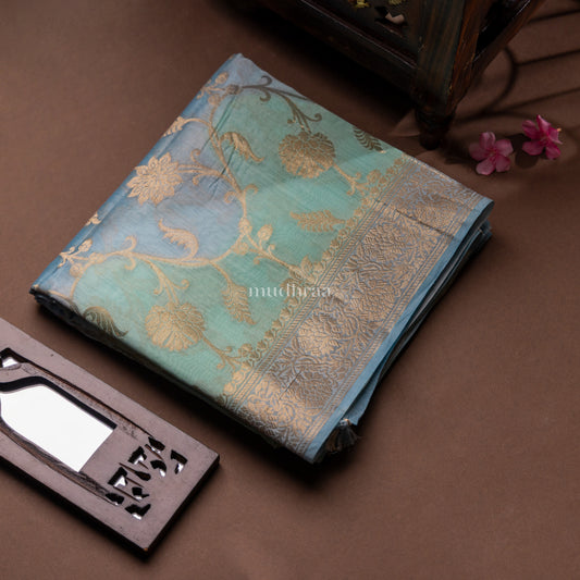 This exquisite tea green Chanderi silk saree features intricate floral motifs and comes with a...
