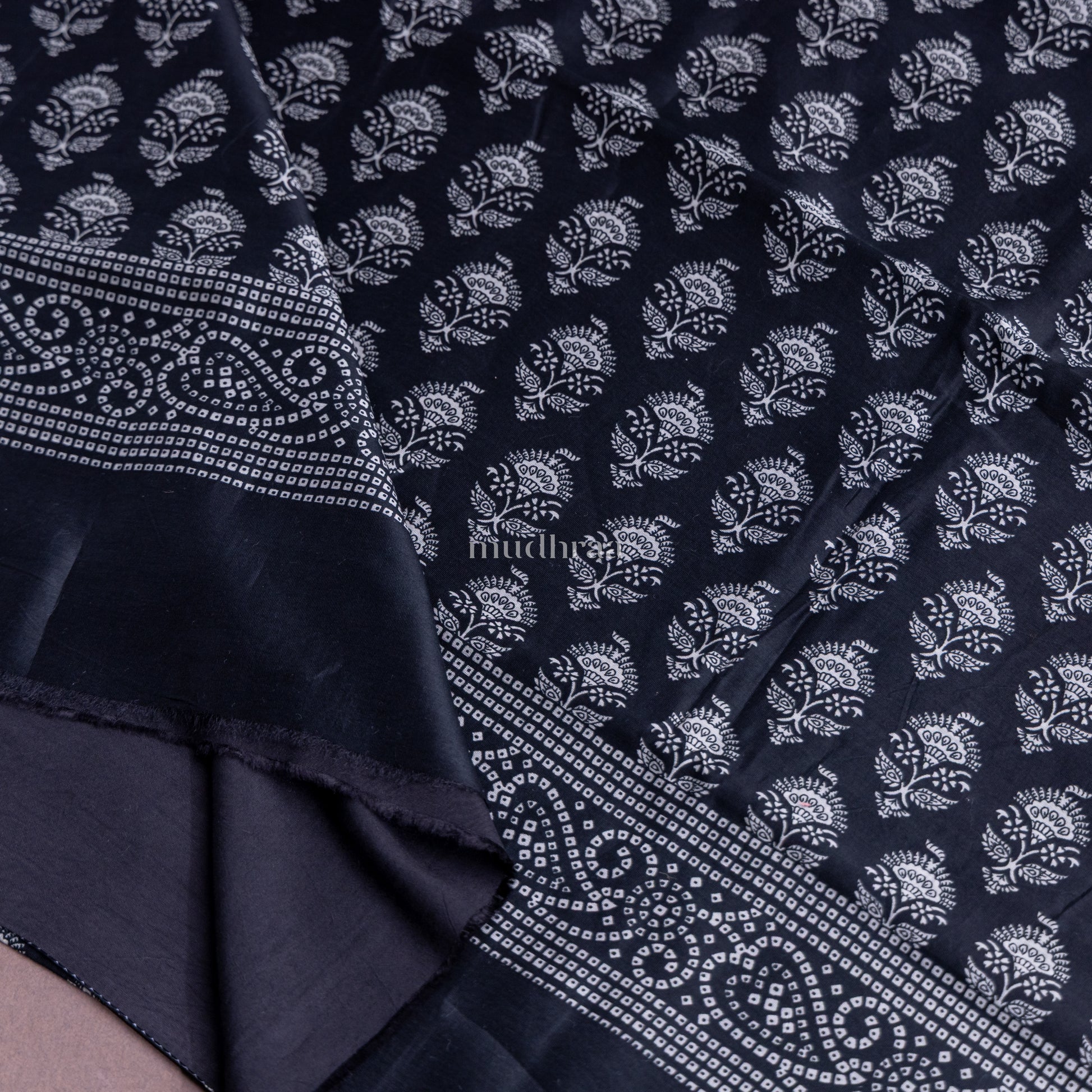 Striking pure chanderi printed suit set in black & white perfect for office looks. Comes with a matching bottom.