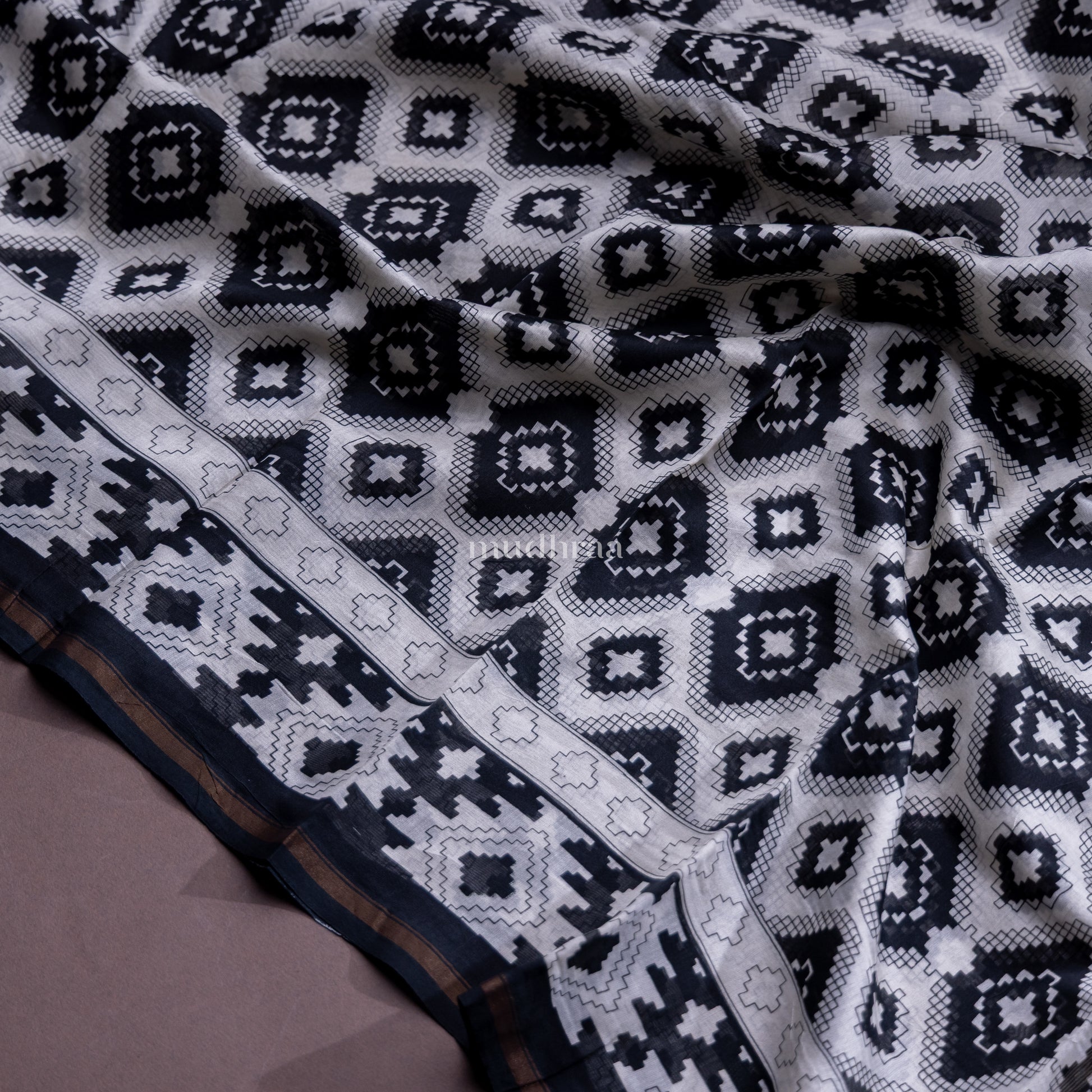Striking pure chanderi printed suit set in black & white perfect for office looks. Comes with a matching bottom.