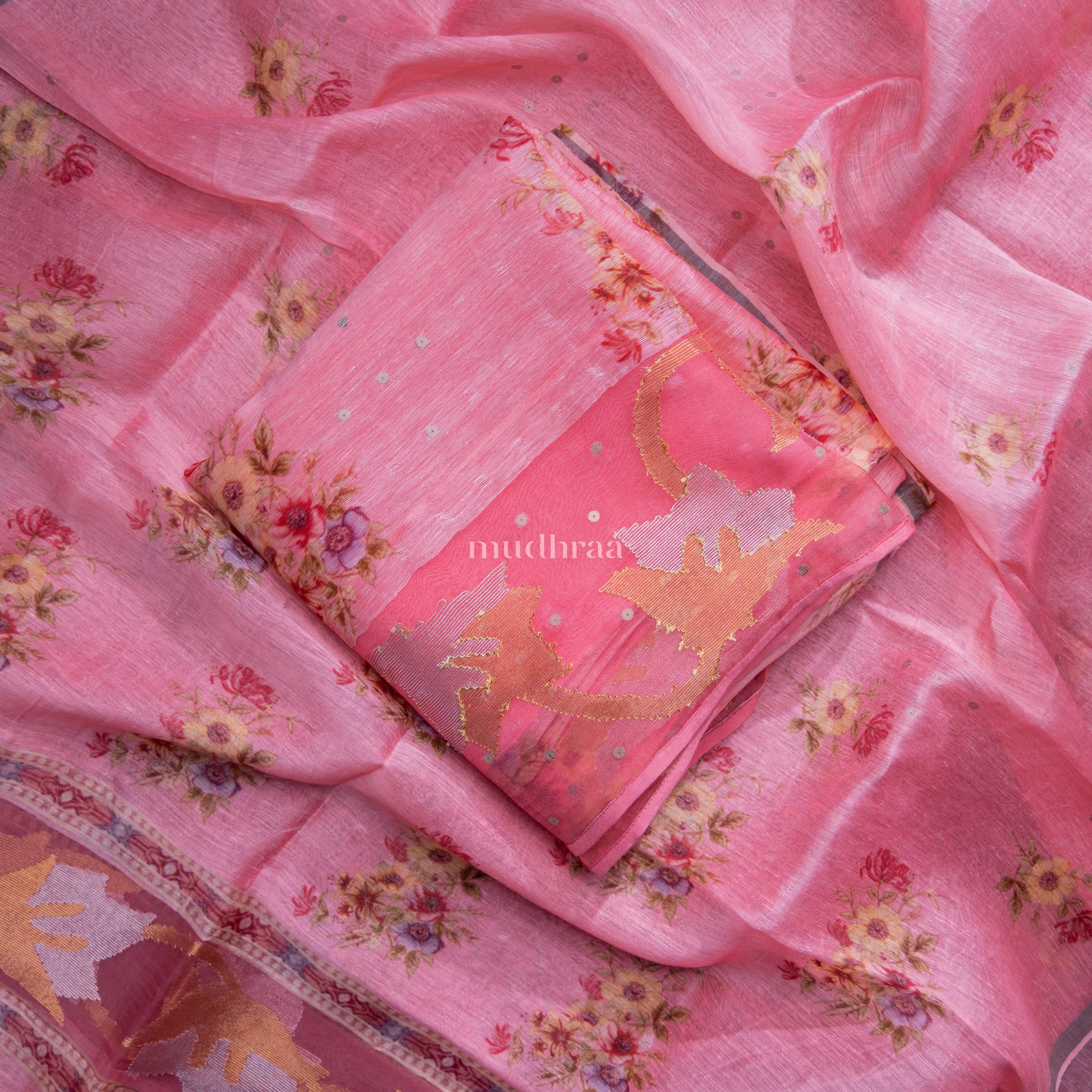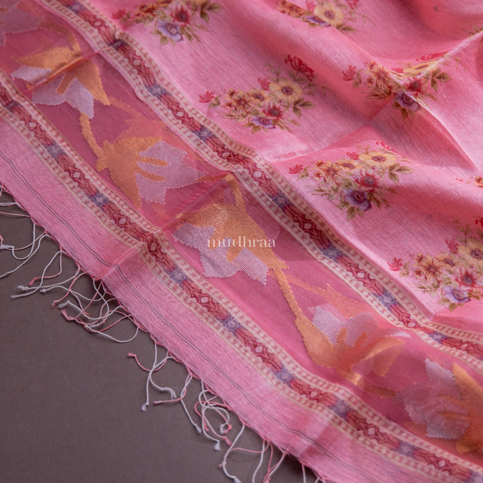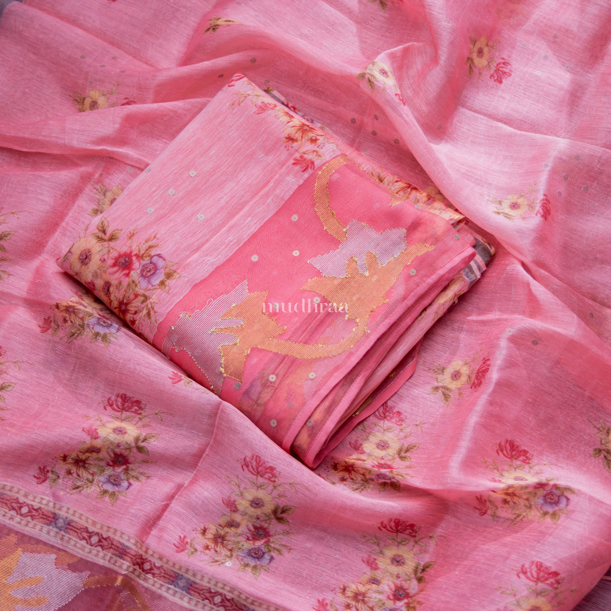 Striking candy pink pure linen suit set with floral prints and sequin work detailing with muslin jamdani woven motifs.