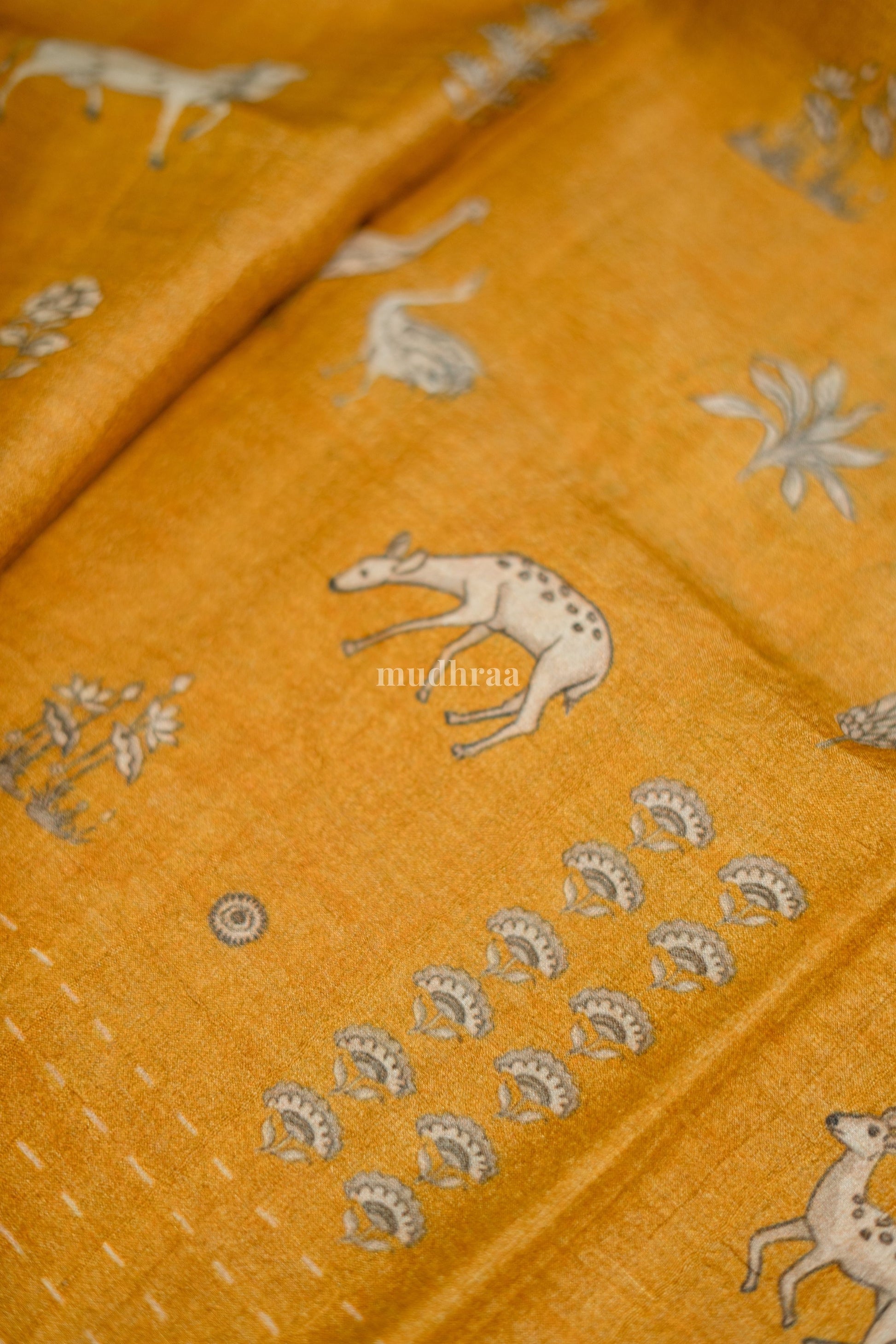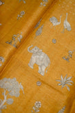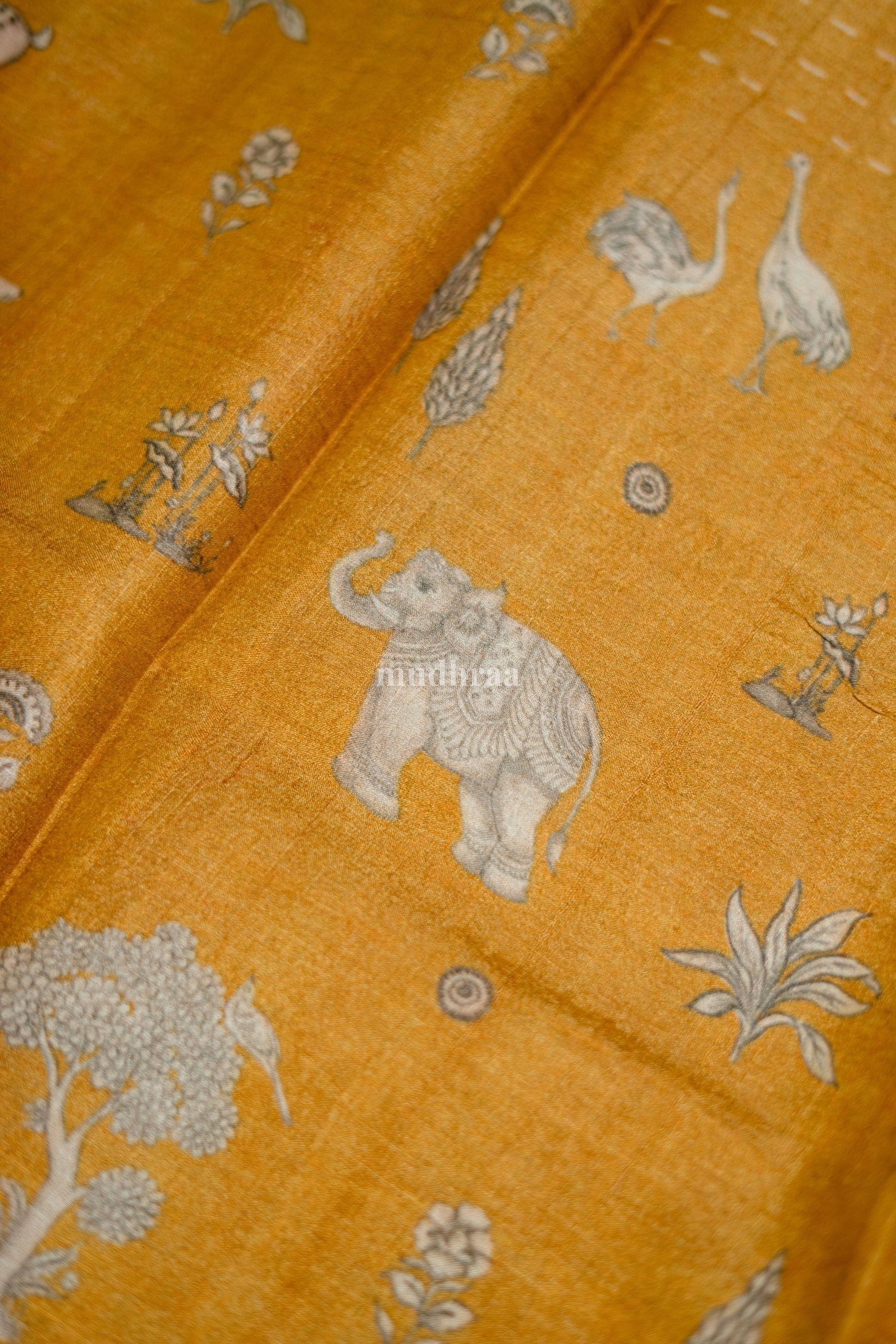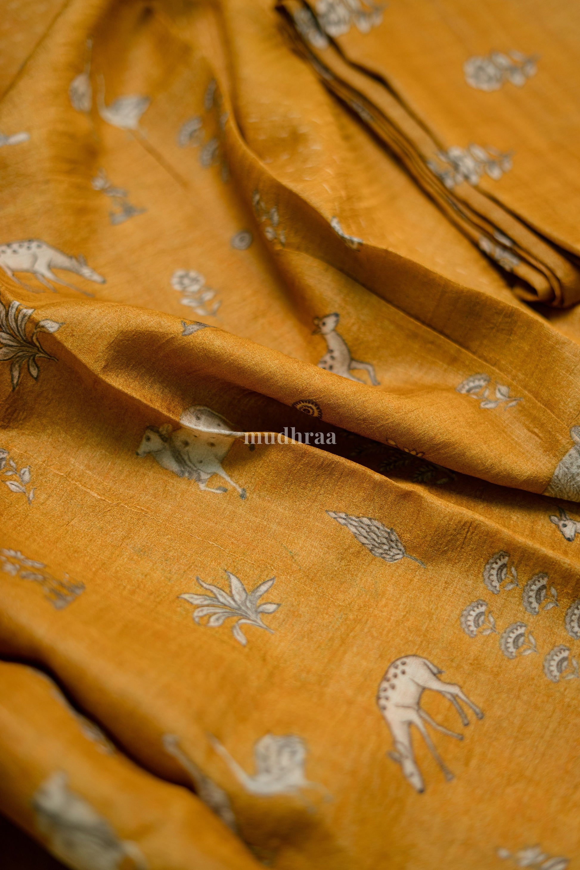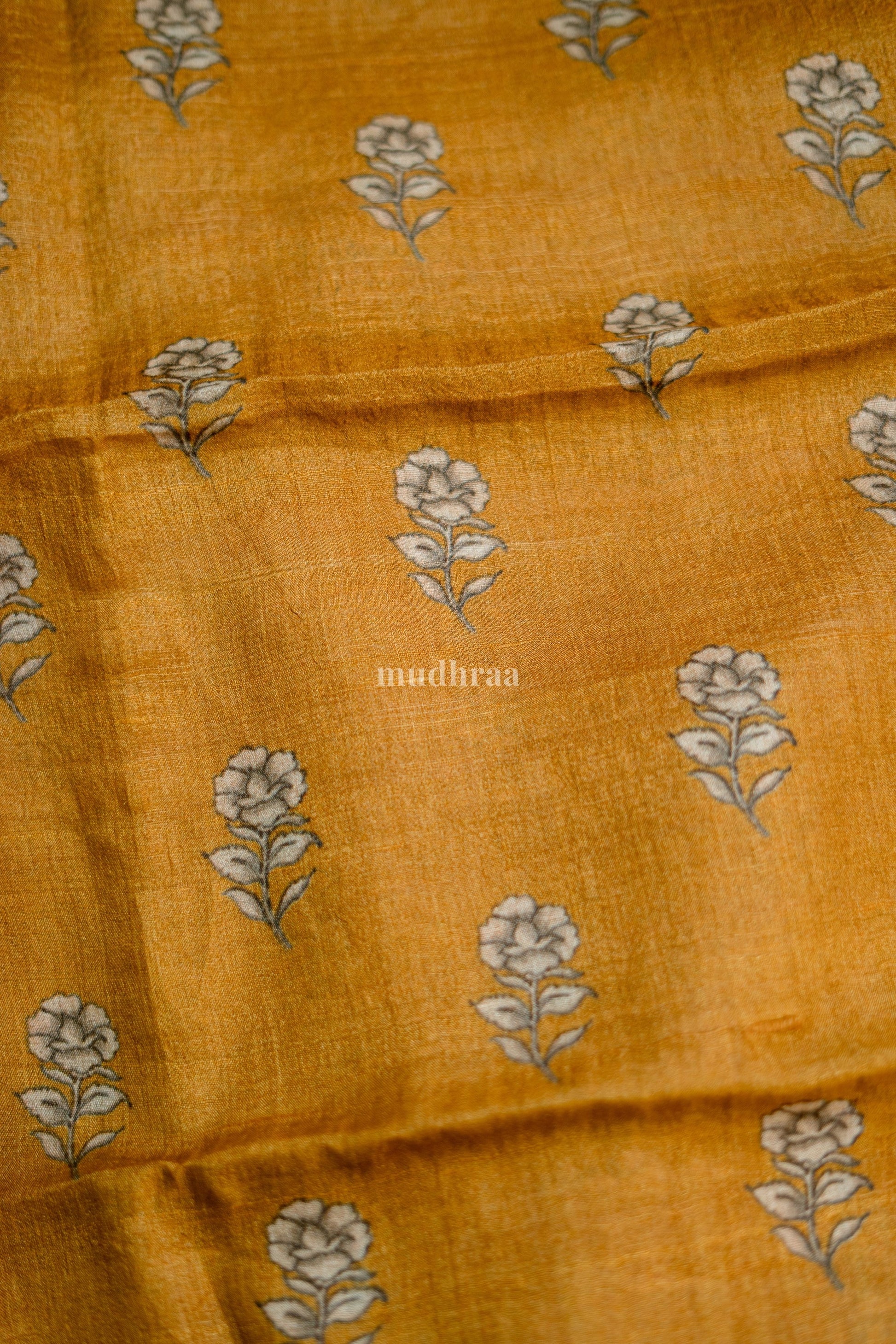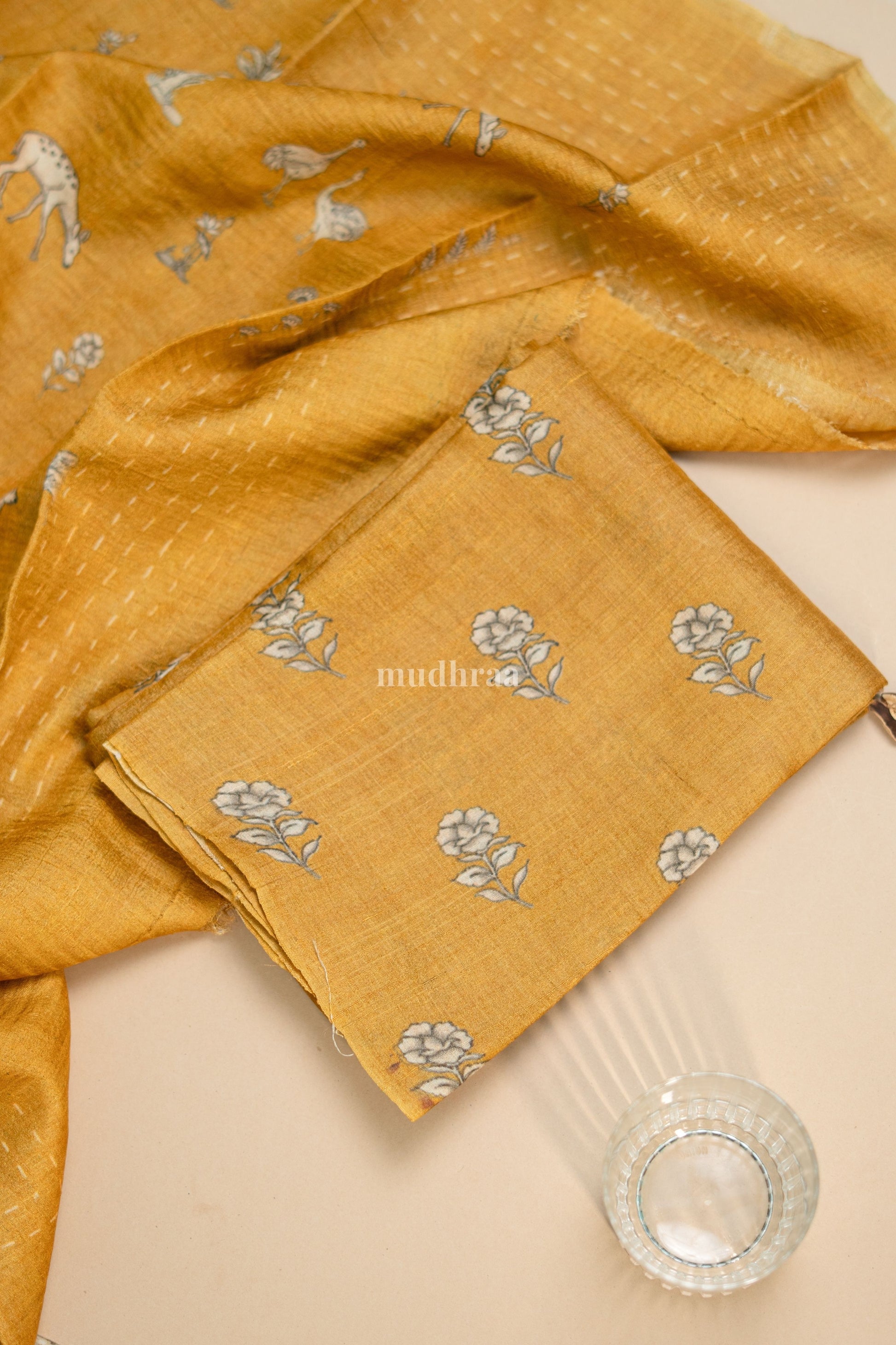 A beautiful printed golden yellow pure Tussar suit paired with a digitally printed pure Tussar dupatta. This is a two-piece set.