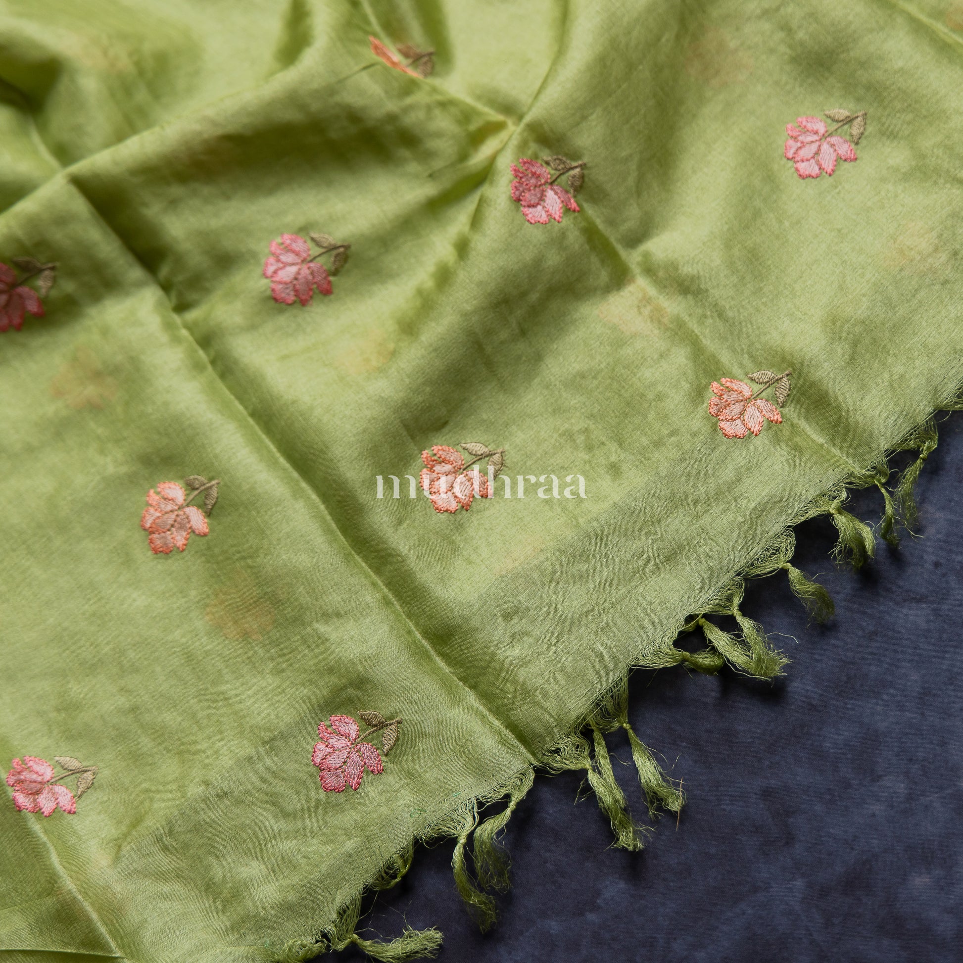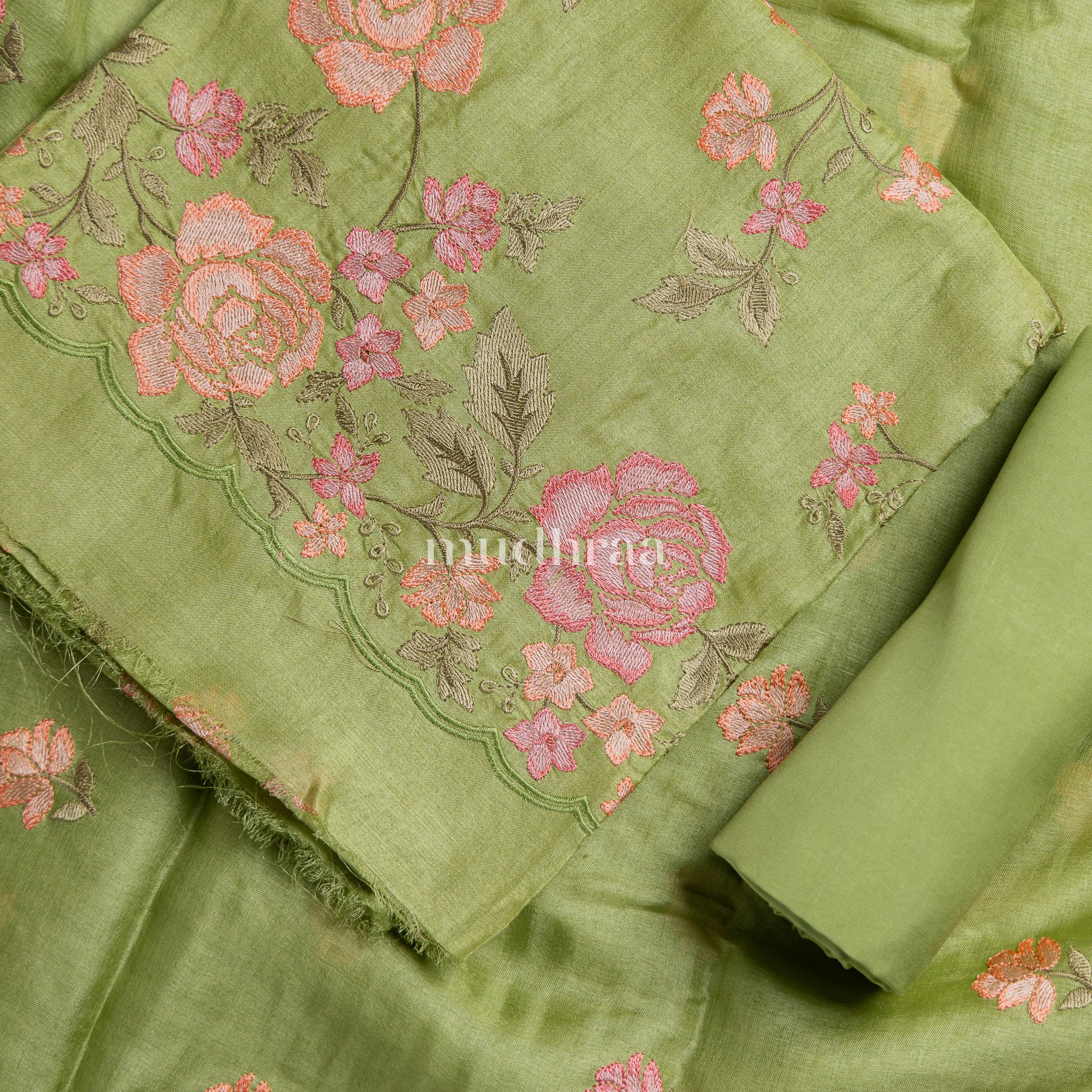 Pretty green tussar suit set with all over embroidered work in floral pattern in both top and dupatta. Comes with a matching bottom material.