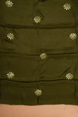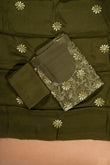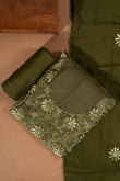 This moss green Kora Kantha suit set showcases beautiful floral embroidered motifs, adding a subtle charm. It comes with a coordinating bottom and embroidered dupatta, making it the perfect choice for casual sophistication and festive flair.