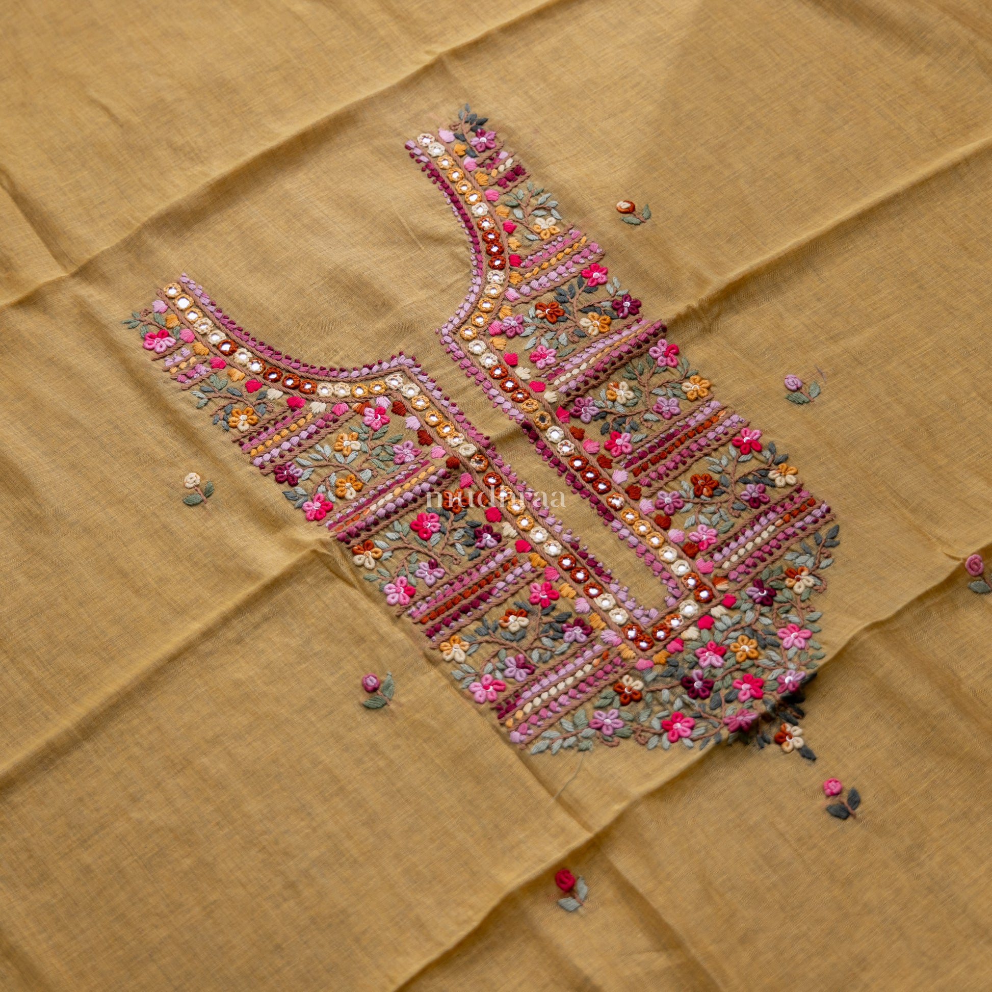 Intricate embroidery work of Phulkari and mirrors all over the neckline , paired with an jamdani woven dupatta with intricate sequin work . Comes with a matching bottom material.