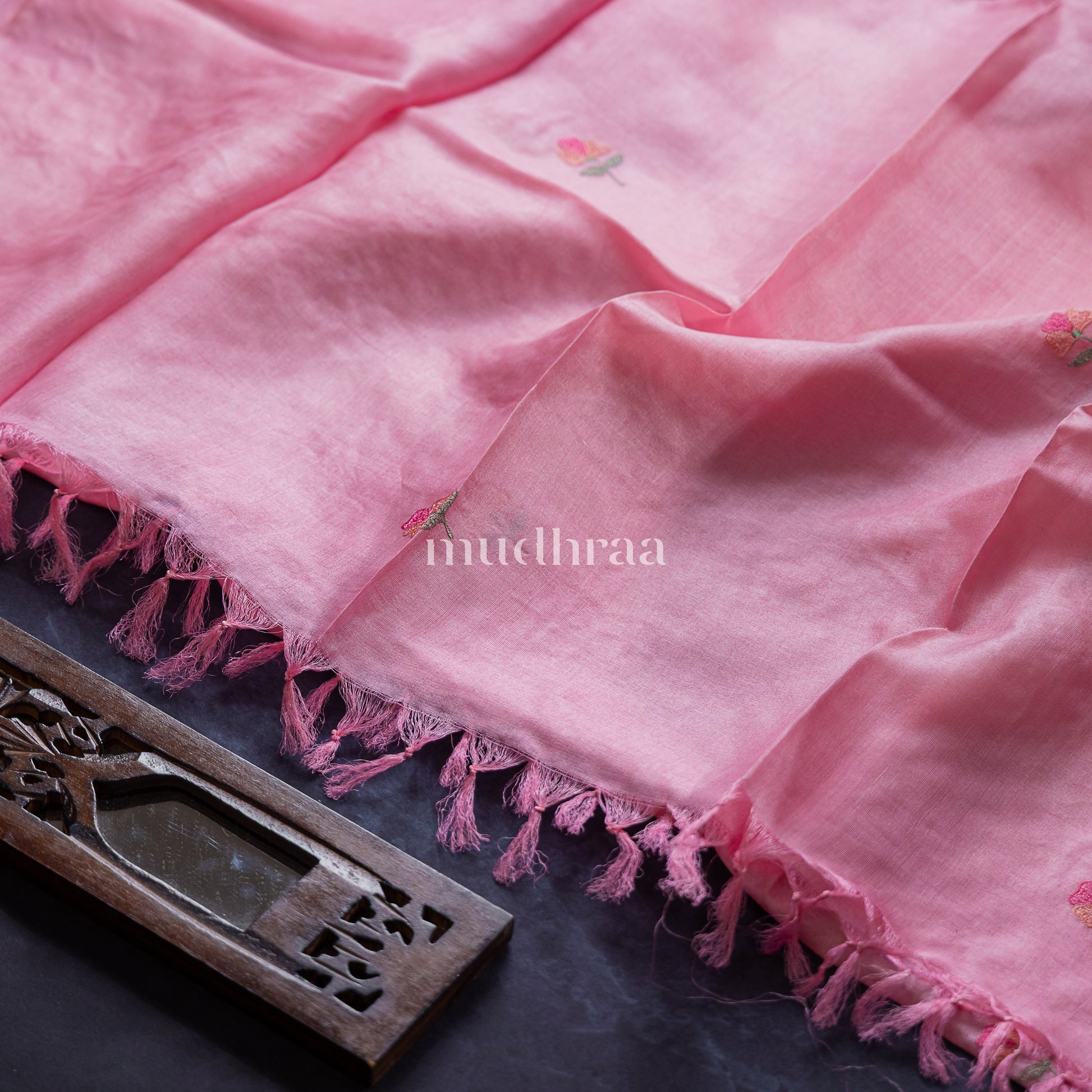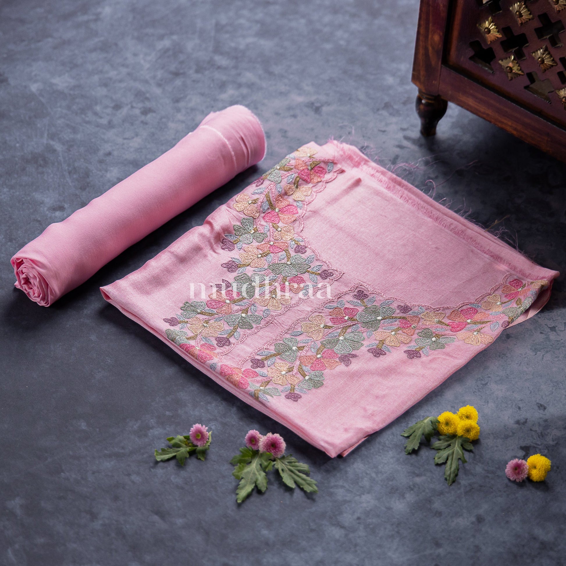 Pretty pastel pink pure tussar suit set with floral embroidered neckline with embroidered dupatta. Comes with modal satin bottom.