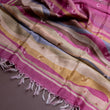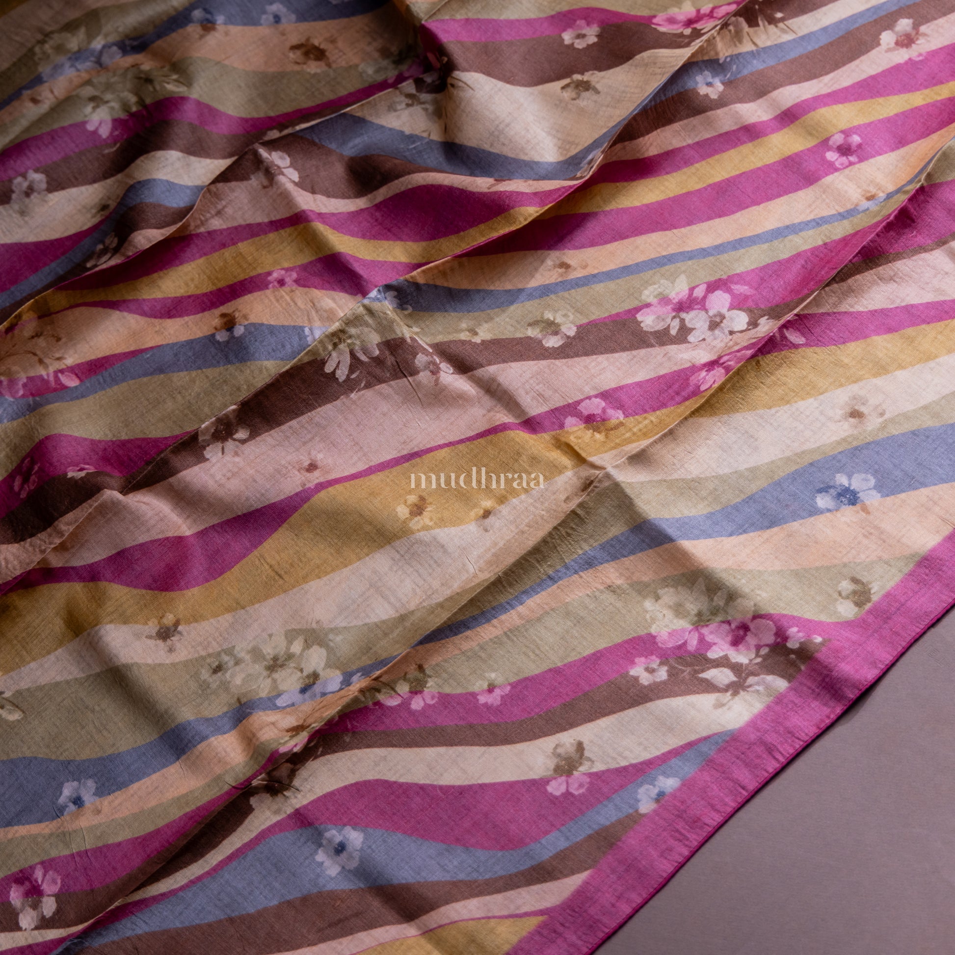Smart pure tussar suit material with digital printed stripes & floral motifs all over the top and with a detailed printed dupatta. Comes with a matching bottom material.