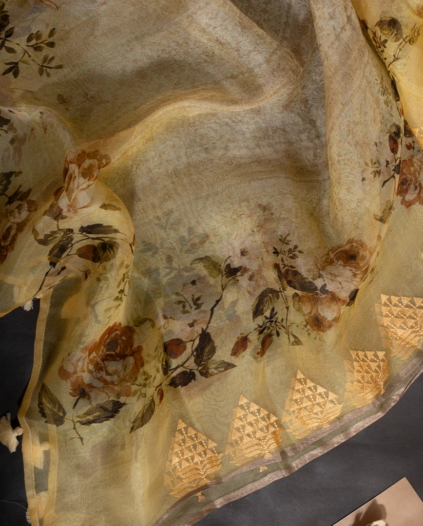 Lightweight and breezy kora silk top & dupatta , digital printed and hand embroidered . Matched with woven yellow silk cotton bottom.