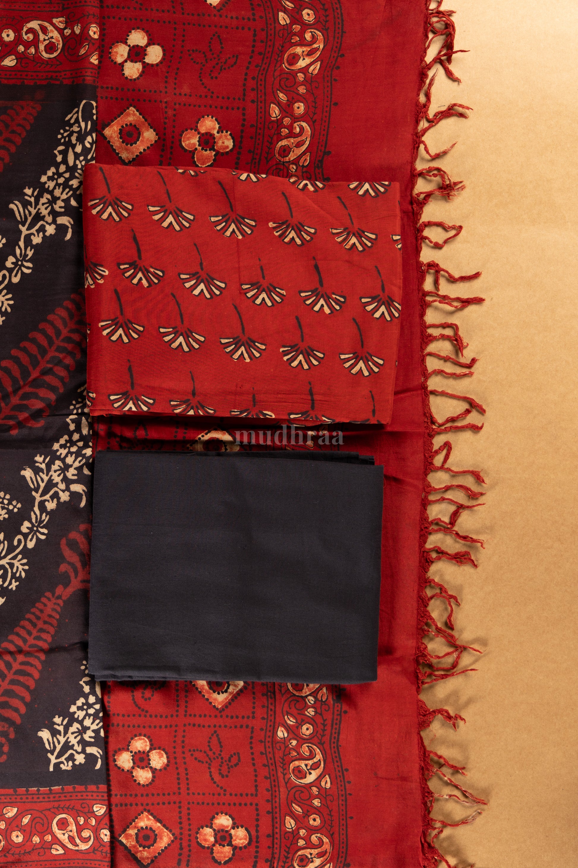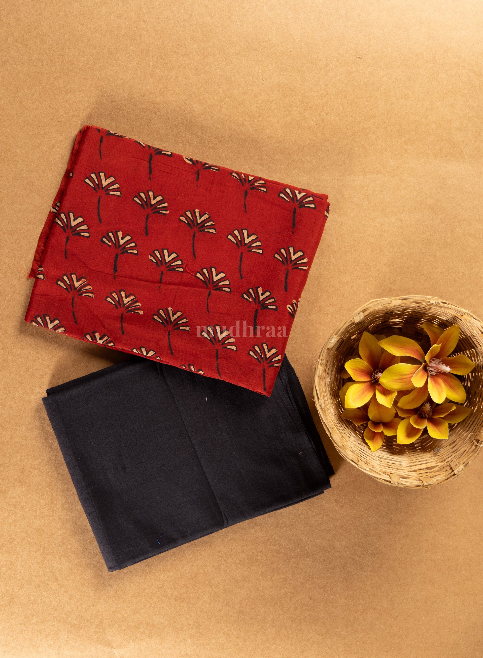 Earthy and cool for summer plant fibre top & dupatta , handblock printed intricately in lovely terracotta shade contrasted with black dyed bottom material.